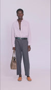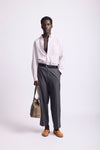 - Calça alfaiataria com fenda na barra que possibilita deixá-la reta ou mais ampla.